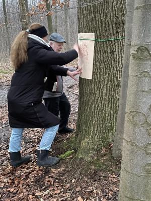 Die jüngste Waldlaborfortbildung am 12.02.2025 führte die Teilnehmerinnen zunächst aus den warmen Räumen des Waldlabors hinaus in den Wald. Dort sollten sie die besonderen Erscheinungsformen des Winters im Wald mit eigenen Sinnen wahrnehmen und ihre Eindrücke beschreiben. Wie gehen wir selbst mit solchen eher unwirtlichen Bedingungen um? Diese Frage war leicht zu beantworten. Unter der sachkundigen Anleitung von Jessica Saalfeld wurde dann gemeinsam erarbeitet, welche Strategien die einheimischen Tiere haben, um in dieser Jahreszeit zu überleben.