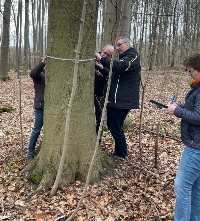 Wie viele Bäume stehen im Stadtwald? Wie alt ist ein Baum? Welche Höhe hat er? – Mit solchen und ähnlichen Fragen haben sich die Teilnehmerinnen und Teilnehmer der Waldlabor-Fortbildung „Mathe im Wald“ beschäftigt. Nach einer kurzen theoretischen Einführung begab sich die Gruppe unter der Leitung von Marco Hagedorn und Revierförster Andreas Schwan vom Regionalforstamt Soest-Sauerland in den Wald. Bewaffnet mit Maßbändern,  „Försterdreieck“ und mit Absperrband zur Markierung einer Testfläche ging es vom Waldlabor aus in den Forst, um vor Ort einige Messungen vorzunehmen und die gemessenen Werte einzuordnen.