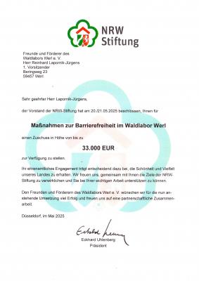 Die NRW-Stiftung unterstützt unsere Arbeit im Waldlabor seit der Gründung des Vereins. Besonders die gute Ausstattung unserer Einrichtung verdanken wir im Wesentlichen der Stiftung. Wir sind dafür sehr dankbar und freuen uns über die neuerliche Hilfe bei der Ermöglichung einer barrierefreien Nutzung des Waldlabors. Es ist schön und beruhigend, einen so starken Partner an unserer Seite zu wissen!